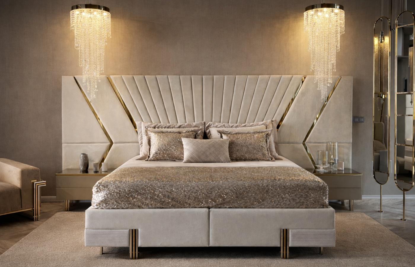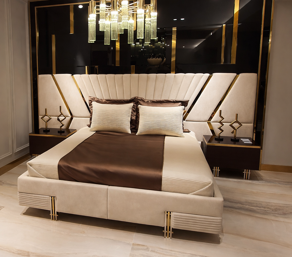 The Piero bed and nightstand are designed for contemporary luxury bedrooms where design precision and refined comfort are equally important. Its bold geometric lines and layered headboard create a strong visual statement while maintaining balanced proportions and a calm, sophisticated atmosphere. The bed is fully upholstered in premium fabric or leather, offering both durability and exceptional comfort. The distinctive headboard design functions as an architectural feature, allowing the Piero bed to define the character of the entire bedroom on its own. Subtle metal accents and elegantly structured legs add a sense of understated luxury without visual heaviness. The matching nightstand complements the bed perfectly in both form and material selection. Clean surfaces, precise craftsmanship and practical storage make it ideal for everyday use, while preserving the exclusive identity of the collection. The Piero bed and nightstand are an excellent choice for those seeking a modern yet timeless solution with no compromises on quality, comfort or aesthetics. Fully customizable in size, upholstery and color options, this model integrates seamlessly into premium residential interiors and high-end interior design projects.