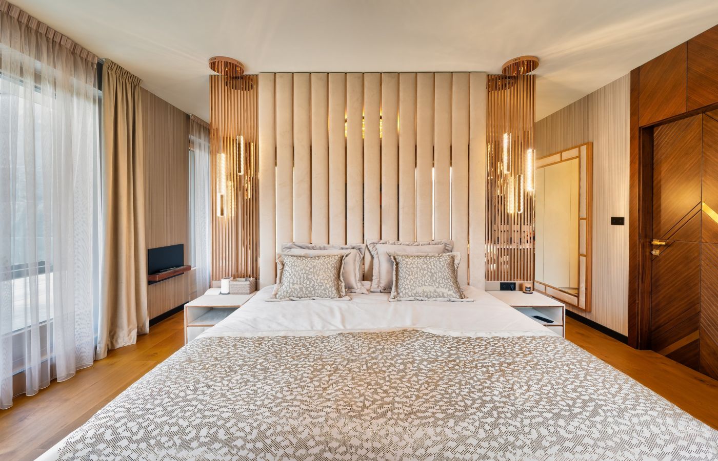 - • Az ágy háttámlájának mérete szabadon alakítható, akár teljes falat beterítő kivitelben is