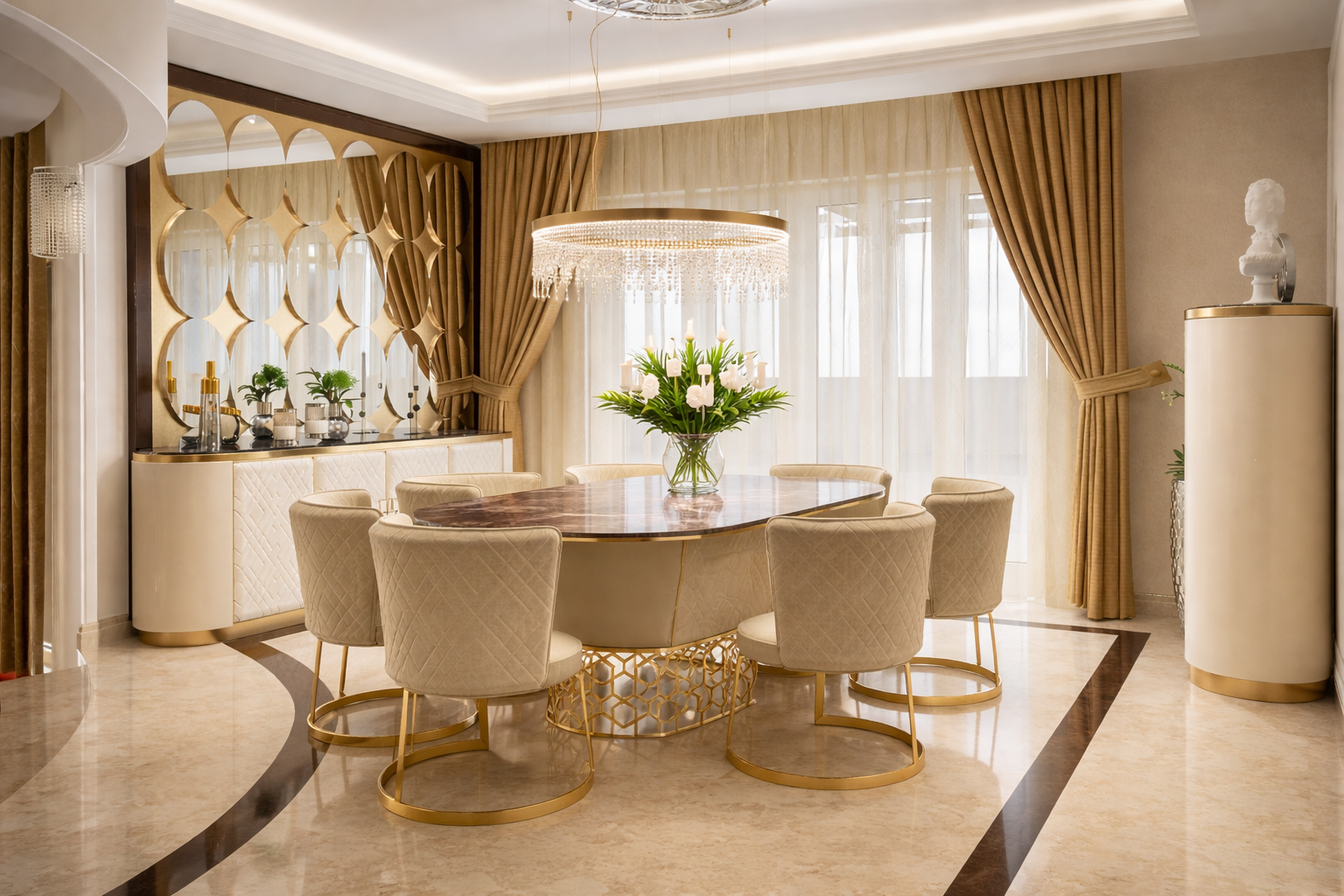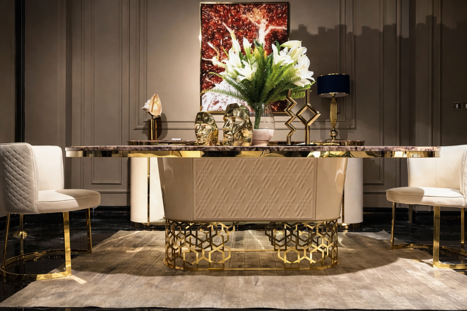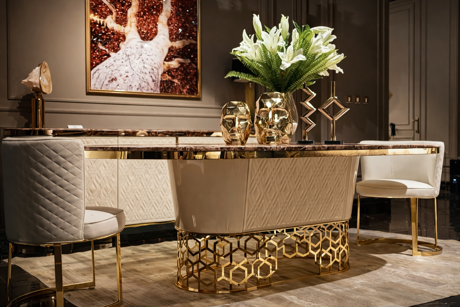 Étkezőasztal kollekcióink minden elvárást kielégítő harmóniával töltik meg a teret, minden napot ünnepnappá varázsolnak. Standard termékkollekciónk között art deco és glamour stílusú bútorok közül válogathatsz de letisztultabb darabokat is találhatsz. Termékeinket a kért méretre készítjük a megrendelő által kért színekben.