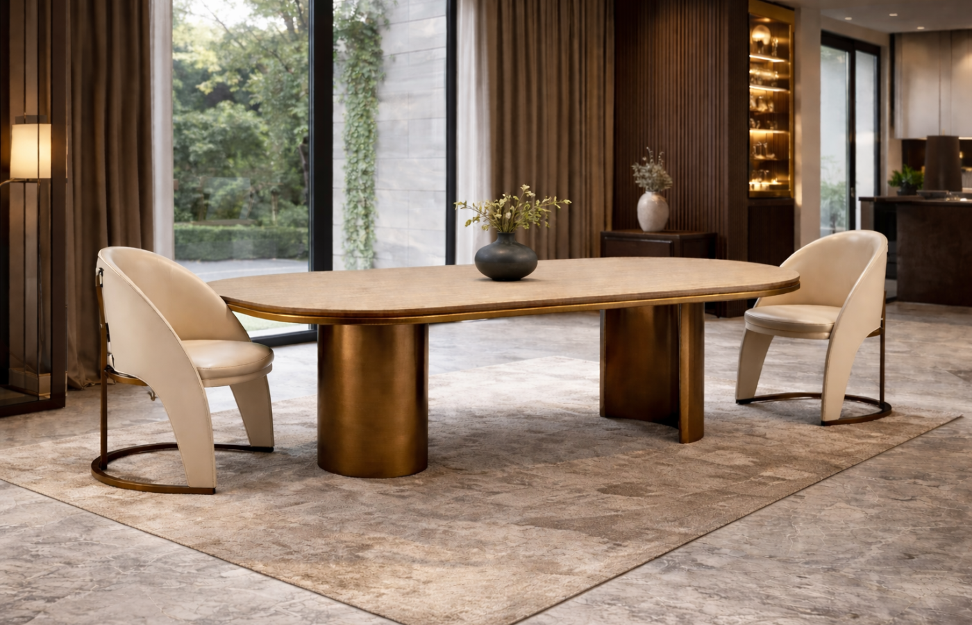 A Kailas étkezőasztal a modern luxus és a karakteres elegancia találkozása. Letisztult, mégis rendkívül határozott formavilágával azonnal magára vonja a figyelmet, miközben harmonikusan illeszkedik kortárs és art deco ihletésű enteriőrökbe is. A masszív, hengeres fém lábszerkezet szoborszerű stabilitást ad az asztalnak, miközben vizuálisan is erőteljes jelenlétet biztosít. A prémium minőségű, nagy méretű asztallap kifinomult arányaival és precíz kidolgozásával igazi fókuszponttá teszi a teret. A Kailas nem csupán egy étkezőasztal – ez egy statement darab, amely luxus lakóterek, reprezentatív étkezők és exkluzív belsőépítészeti projektek meghatározó eleme lehet. Az asztal teljes mértékben testreszabható: méret, felületkialakítás, színvilág és anyaghasználat tekintetében is az ügyfél igényei szerint készül, így minden darab egyedi.