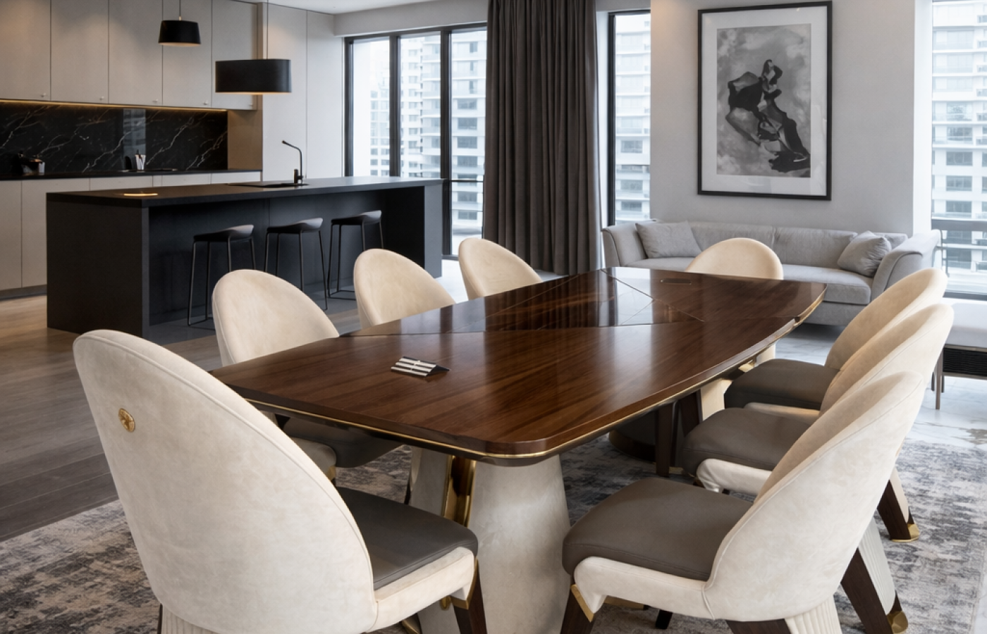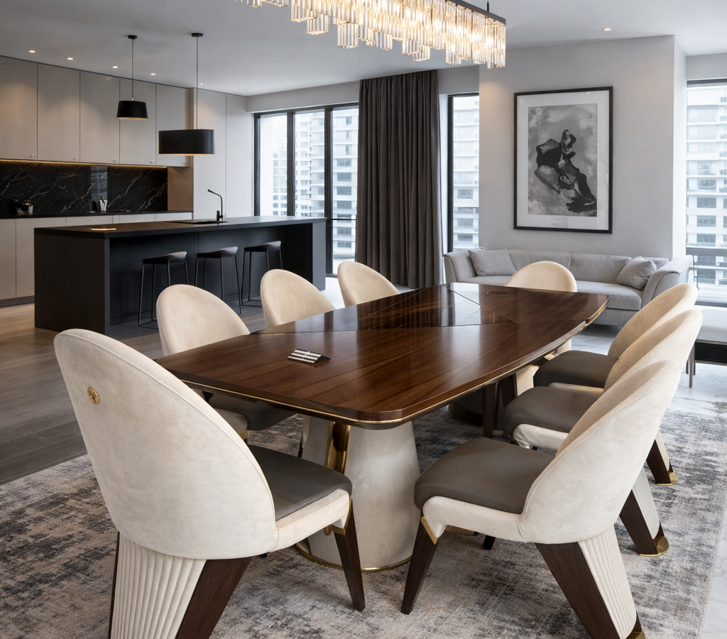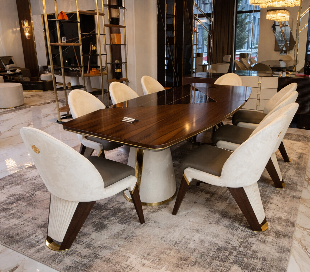 A Niks étkezőasztal a kortárs luxus egyik legkarakteresebb darabja. Formavilágát a modern szobrászat ihlette: dinamikus, szoborszerű lábszerkezete és geometrikus részletei azonnal megragadják a tekintetet. Ez az asztal nem pusztán funkcionális bútordarab, hanem valódi design statement, amely egy tér központi elemévé válik. Az asztallap anyaghasználata és kialakítása tökéletes egyensúlyt teremt az elegancia és a modernitás között. A különböző felületek és textúrák játéka kifinomult megjelenést kölcsönöz, miközben a prémium kivitelezés garantálja a hosszú távú tartósságot és stabilitást. A Niks modell ideális választás reprezentatív étkezőkbe, exkluzív nappalikba és olyan enteriőrökbe, ahol a design nem kompromisszum, hanem alapelv. A teljes mértékben testreszabható méretek, anyagok és színek lehetővé teszik, hogy az asztal tökéletesen illeszkedjen a tér karakteréhez és az egyedi igényekhez.