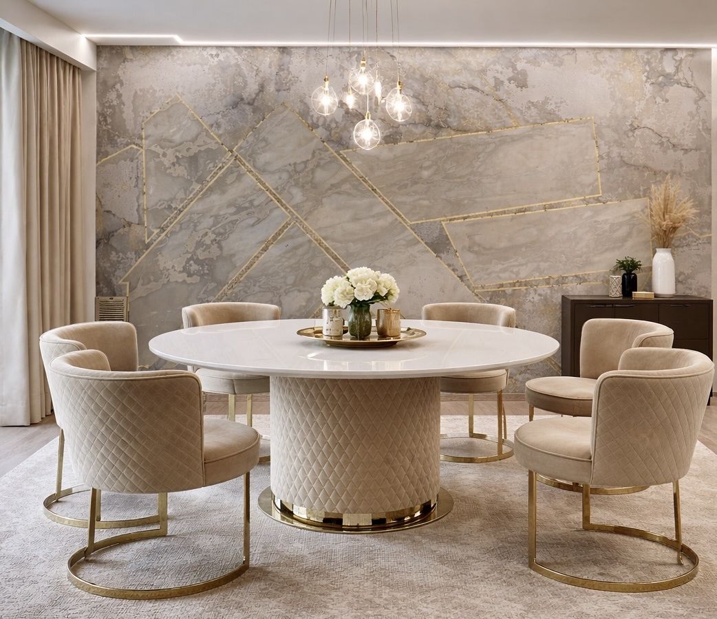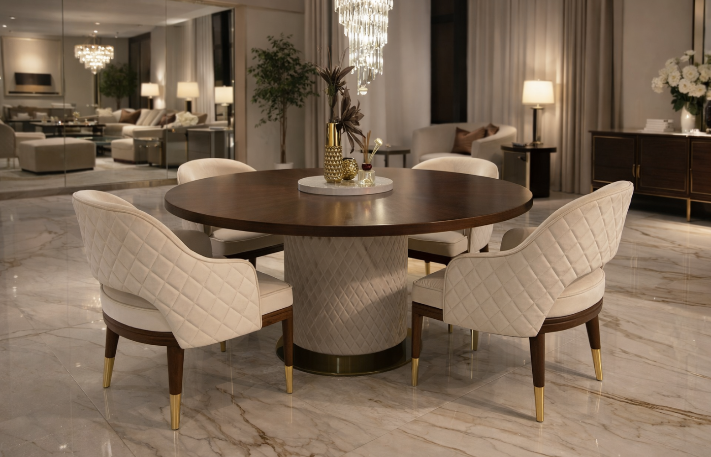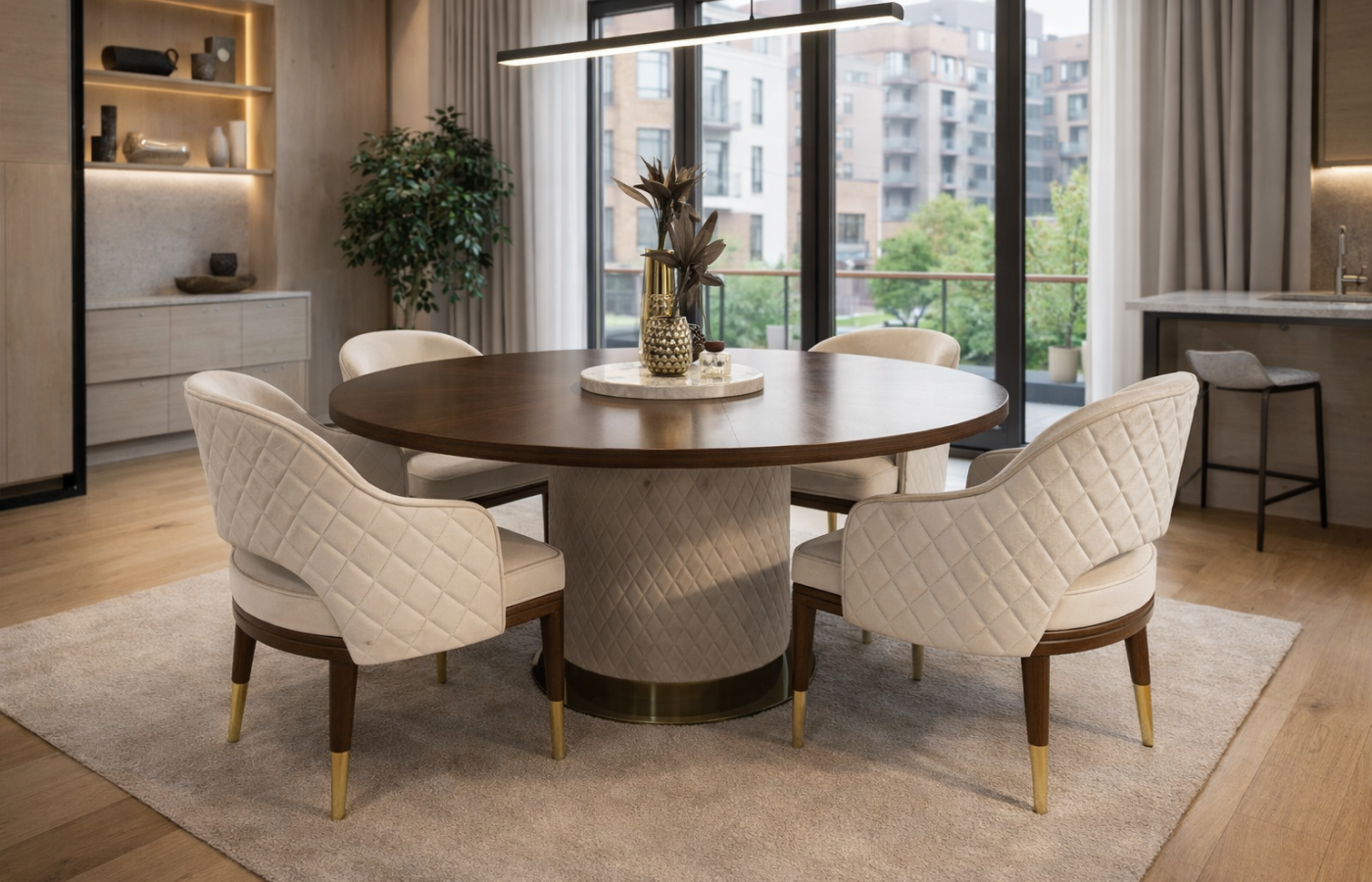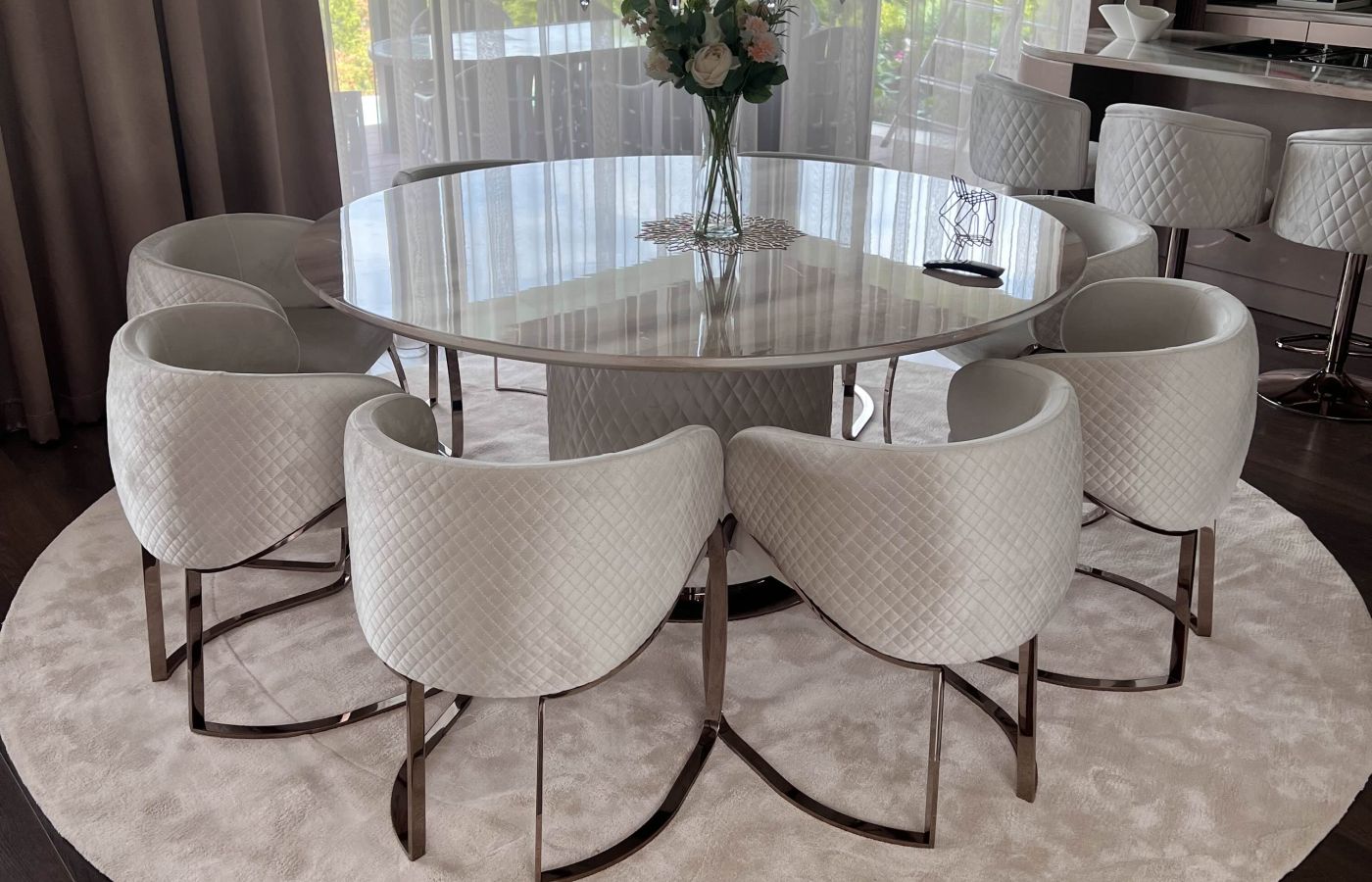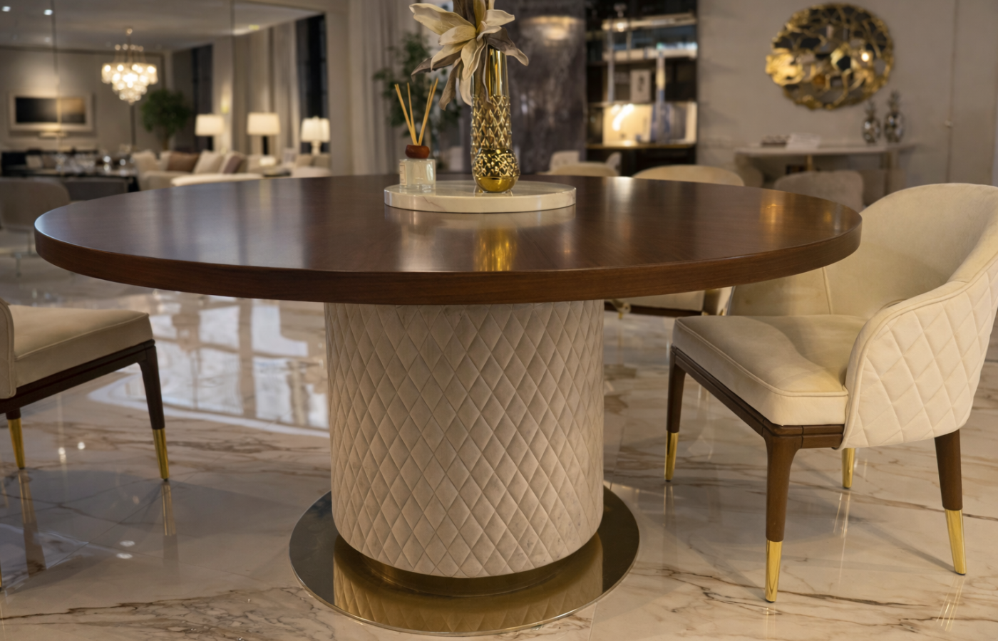 A Penelope étkezőasztal a kifinomult luxus és az időtlen formai elegancia tökéletes egyensúlyát képviseli. Letisztult, mégis karakteres megjelenése a modern enteriőrök központi elemévé teszi, miközben a prémium anyaghasználat és a precíz kivitelezés valódi exkluzivitást sugároz. Az asztallap teljes mértékben testre szabható, és többféle anyagból is készülhet. Választható nemes fafurnérral, valódi kővel, illetve kőhatású, festett MDF felülettel is, így minden megrendelő a saját enteriőrjéhez és stílusához leginkább illeszkedő megoldást választhatja. A felületek gondosan megmunkáltak, selymes tapintásúak, vizuálisan nyugodt, mégis rendkívül elegáns megjelenést biztosítanak. A kör vagy enyhén lekerekített forma barátságos, hívogató karaktert ad az asztalnak, ideálissá téve családi és társasági összejövetelekhez egyaránt. A központi talapzat masszív szerkezete stabilitást és vizuális súlyt ad a bútornak, miközben finoman ívelt formái lágy kontrasztot alkotnak az asztallap letisztultságával. A részletek arányai tudatos tervezés eredményei, így az asztal minden nézetből harmonikus és kiegyensúlyozott. A Penelope étkezőasztal teljes mértékben személyre szabható: választható méretek, különböző felületek, színek és opcionális kiegészítők állnak rendelkezésre. Igény esetén a modell fém betétekkel vagy további valódi kő elemekkel is kiegészíthető, amelyek még tovább fokozzák a luxus megjelenést. Ez az asztal nem csupán funkcionális bútordarab, hanem az enteriőr egyik meghatározó design eleme, amely hosszú éveken át értéket képvisel.